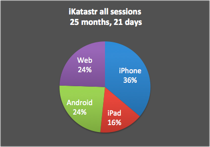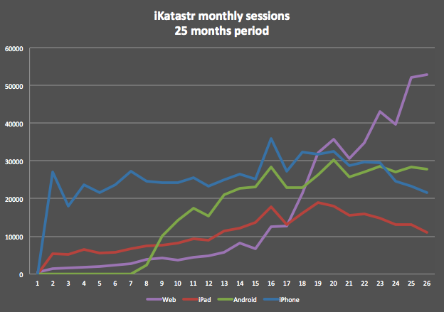Following graphs shows more than 2 years overview of project iKatastr on various platforms – web site, iOS, Android. Project iKatastr does simple stuff – shows cadastral map and enables user to tap on map and get information from the parcel registry (e.g. owner) in Czech Republic. Except Android version, all started at the same time 2 years ago for web, iPhone and iPad. All of the users of iKatastr are solely Czech consumers and thus reflect situation in the Czech app stores and web.